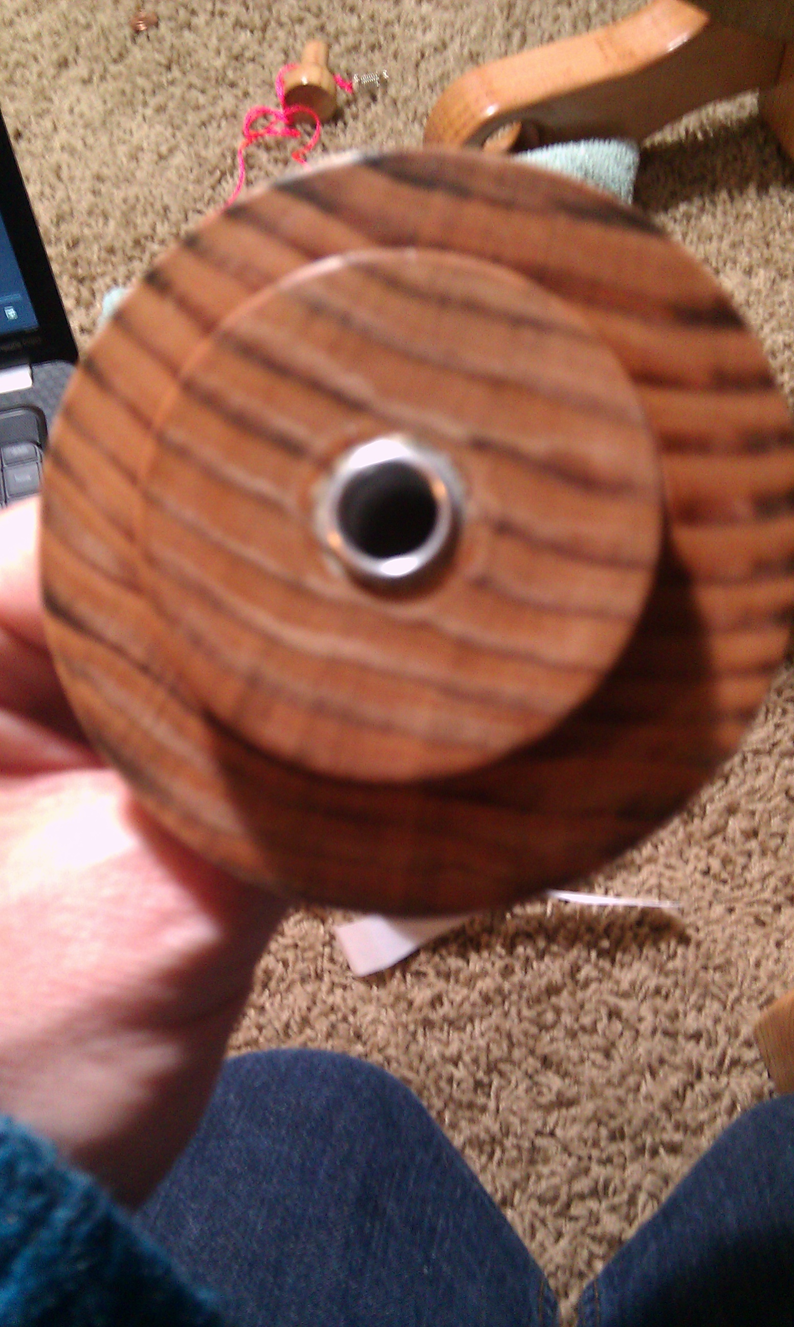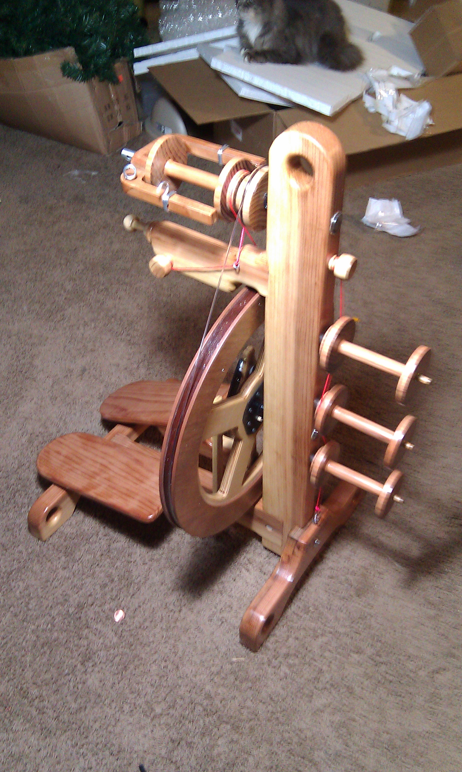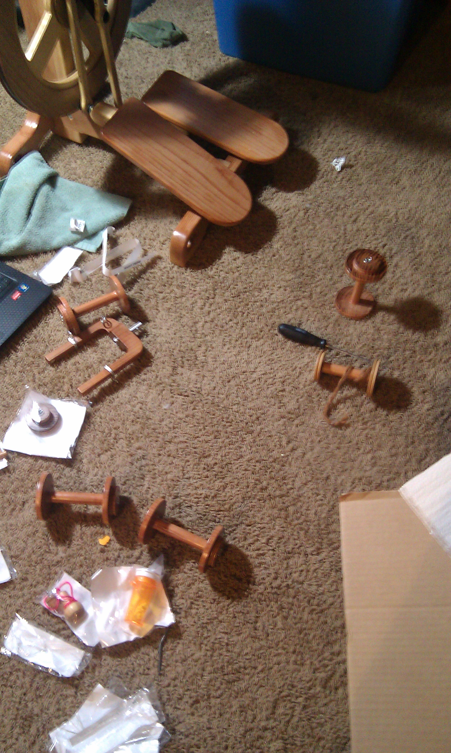 One my christmas gifts this year from my wonder hubs was a beautiful handmade Sequoia spinning wheel. It’s made from redwood and just gorgeous. The wheels are made to order so depending on where you are on the list will determine how fast you receive your wheel. I love this wheel the craftsmanship is beautiful and it spins so smoothly. Some of the features are: it stands on 4 legs that double as lead-holes for plying, it has an on board tensioned lazy kate, comes with 4 ratios but the whorls are interchangeable which means you can ask for customized whorls, the maiden doubles as an orifice hook, and comes with 4 bobbins standard. The wheel comes partially disassembled with everything you need to assemble it in the box(they even included the screwdriver). It took me about 45 minutes to assemble. I actually ran into a what I thought was a problem and called the company they were right there I talked to both Ben and Joanie. They were able to talk me right thru the issue immediately. They both were incredibly sweet. Spinning on the Sequoia is definitely different than my Ashford Joy. The orifice sits much higher. I find that I sit much further away from the wheel. That felt a bit strange at first but I found I was spinning the exact same way that I do on my Joy or a drop spindle and I got very comfortable. Here are some of my pictures when I was assembling my Sequoia.