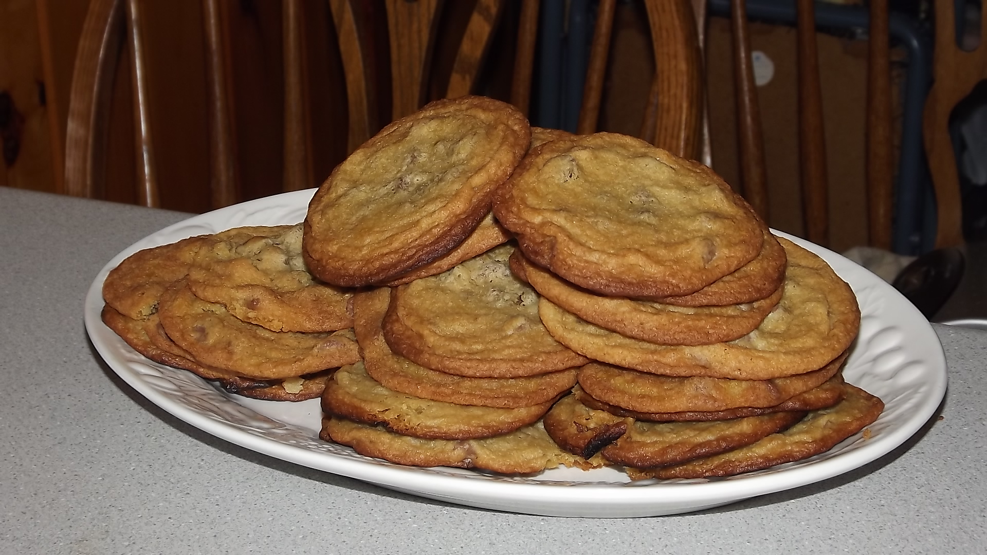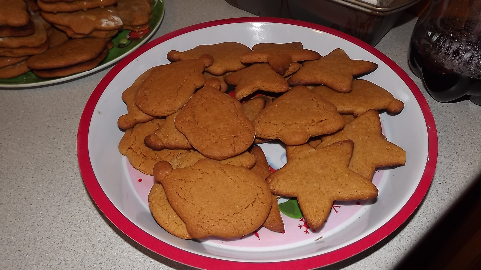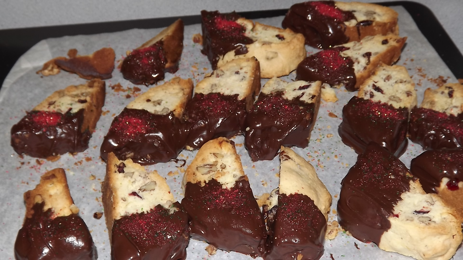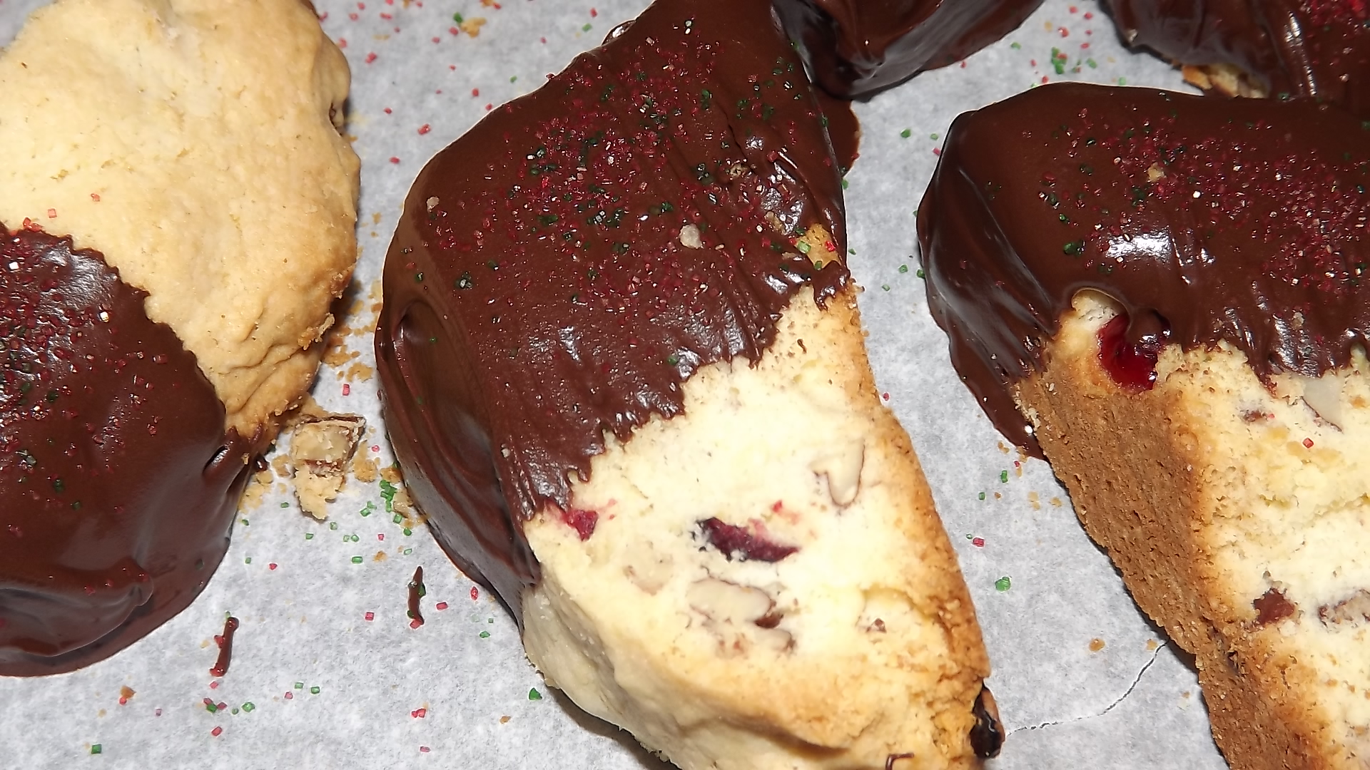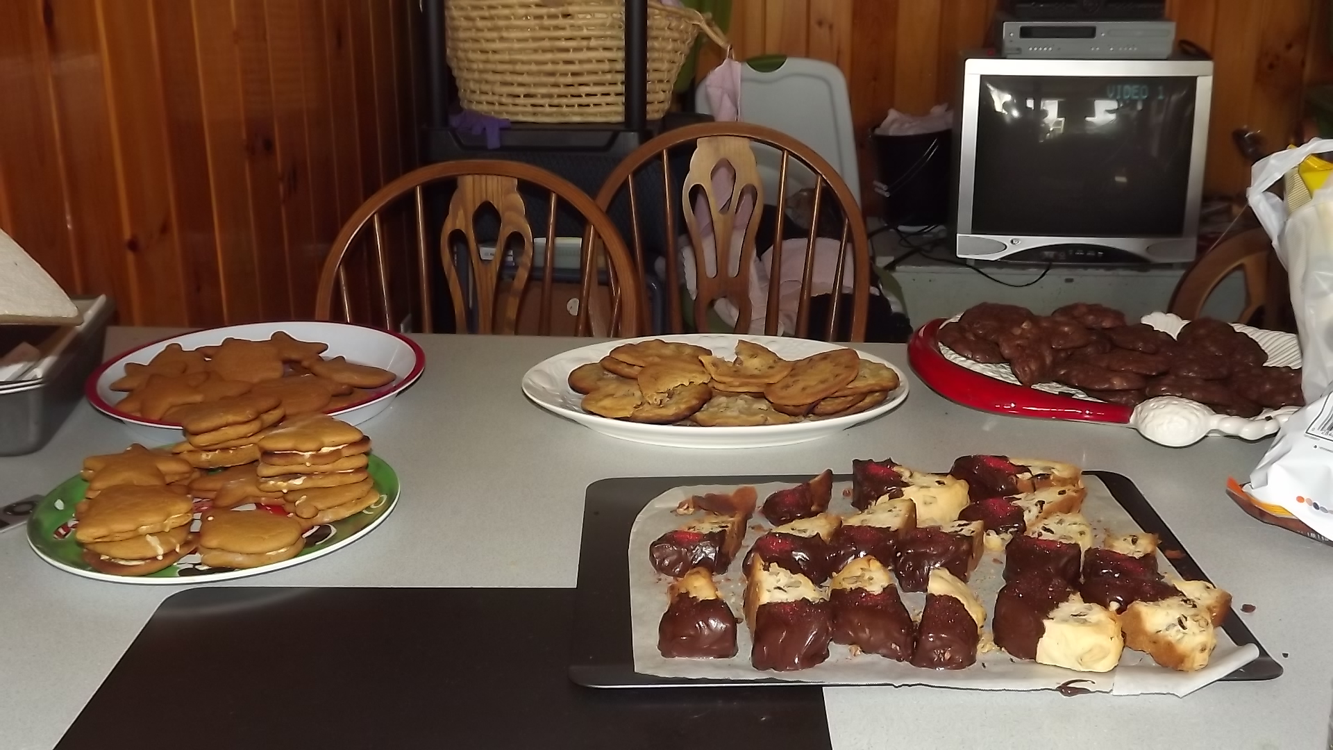 I had some issues with my oven temps. This old oven has always done great I had finished the chocolate covered cherry and gingerbread cookies. For the the chocolate chip the temp needed to be raised from 350 to 375. So doing what I normally did I raised the temp. However the cookies came out really weird and were done about 7 mins early. I have an additional oven thermometer for dyeing fiber and put it in the over. Although the stove said 375 it was really like 500 degrees. hmph! So I turned it down to 300 after 45 mins it read at 350 …..what the heck!!!! I baked the last of the chocolate chip on 350 because I was afraid to change it anymore.  Luckily the biscotti was suppose to be at 350 so it got baked up too.