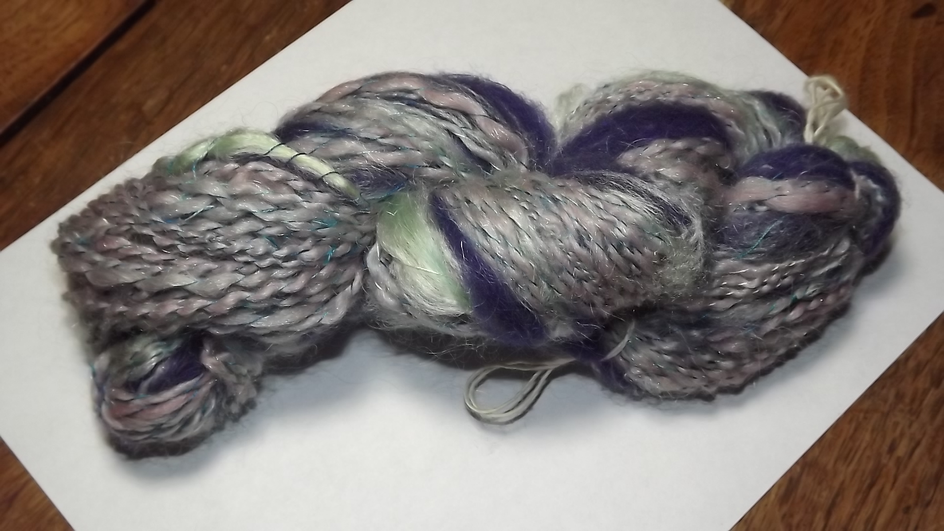 So I figured the some spinning I started last week would be a welcome short break. I started with some Opps basic blend batts and a wool/ mohair batt. I used the wool/mohair batt to make nubs in the spinning and tried to keep the bbb spinning very even. I decided to ply with a silk thread dyed turquoise. Here is what I ended up with.